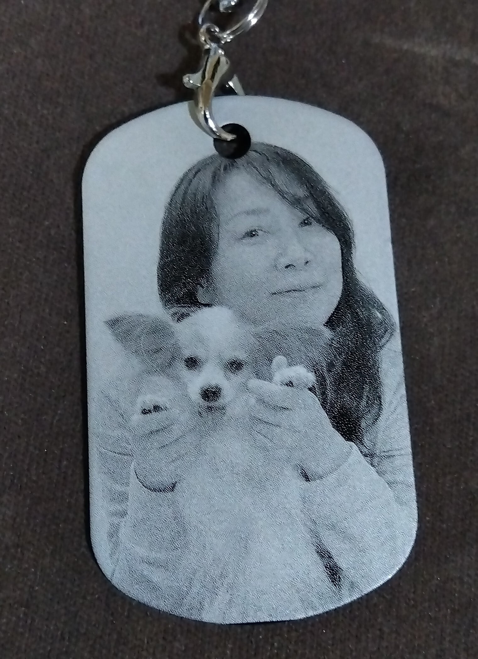 大切な写真や情報を刻印できる、29×49mmのアルミ黒ブランク材を使用したドッグタグです。写真の再現性が高く、QRコードの読み取りやすさにも配慮した素材を採用しています。